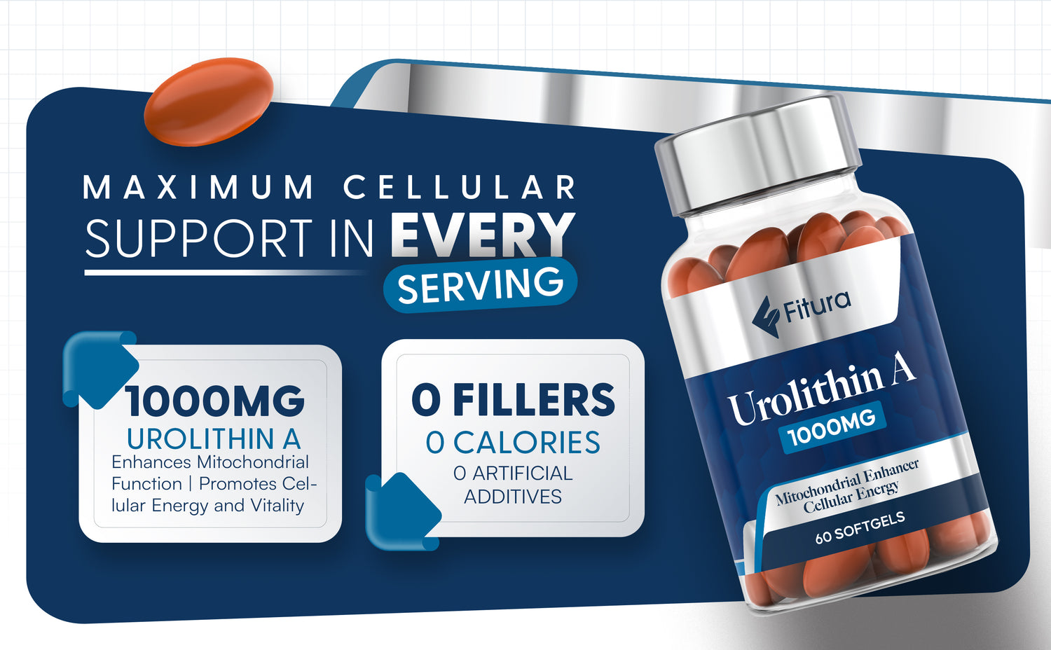 Urolithin A is a naturally occurring compound that helps renew your body’s mitochondria — the tiny powerhouses inside your cells that produce energy. As we age, mitochondrial efficiency declines, leading to fatigue, slower recovery, and muscle weakness. Fitura’s Urolithin A activates a process called mitophagy, which clears out old, damaged mitochondria and helps your body create new ones for stronger, longer-lasting energy.